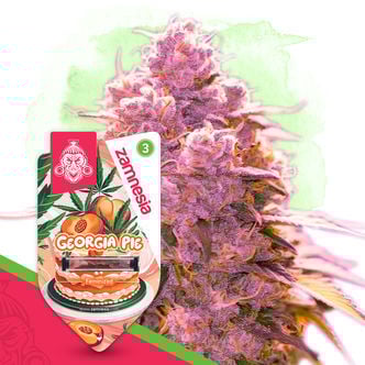 Las mejores genéticas estadounidenses: La Georgia Pie de Zamnesia desciende de la Gelatti y la Kush Mints. Deliciosos aromas y sabores: Huele y sabe a melocotones caramelizados y masa de tarta. Grandes cosechas: 500g/m² en interior y 500g por planta en exterior. Efectos relajantes: 20% de THC y un subidón alegre y despreocupado.